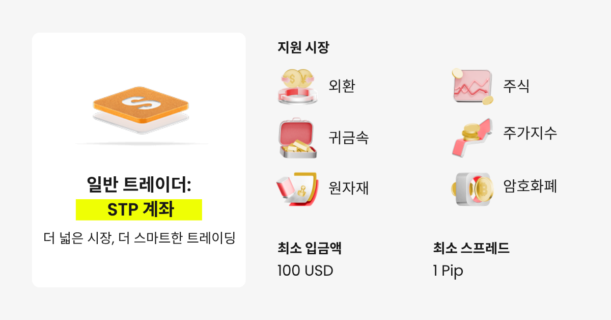 또한 STP 계좌는 Cent 계좌와 달리 다양한 거래 상품을 거래할 수 있어 포트폴리오 다변화를 원하는 트레이더에게 적합합니다.