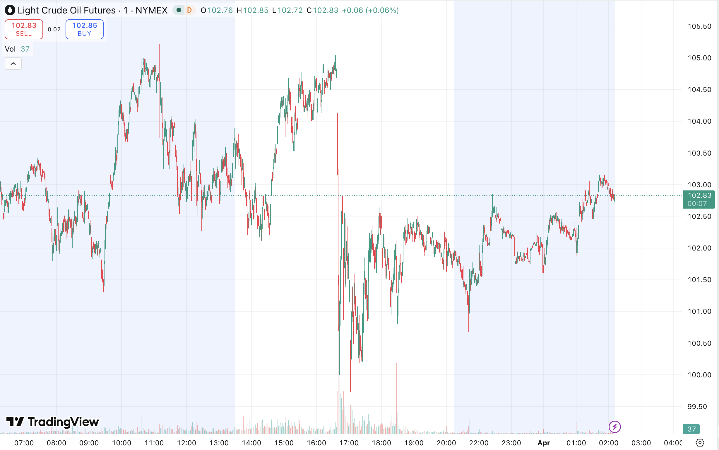 油价周二冲高回落,美原油一度触及 3 月9 日 以来新高至 106.86 美元/桶,布伦特 6 月原油期货结算价下跌逾 3 美元,因未经证实的媒体报道称伊朗总统表示已准备好结束战争,但需获得相关保障, 6 月布伦特原油期货收跌 3.42 美元报每桶 103.97 美元;不过布伦特 5 月合约在到期日上涨 4.94% 至 118.35 美元,该合约 3 月创下 64% 的月度涨幅纪录,美原油 3 月涨幅约 52% 为 2020 年 5 月以来最大。