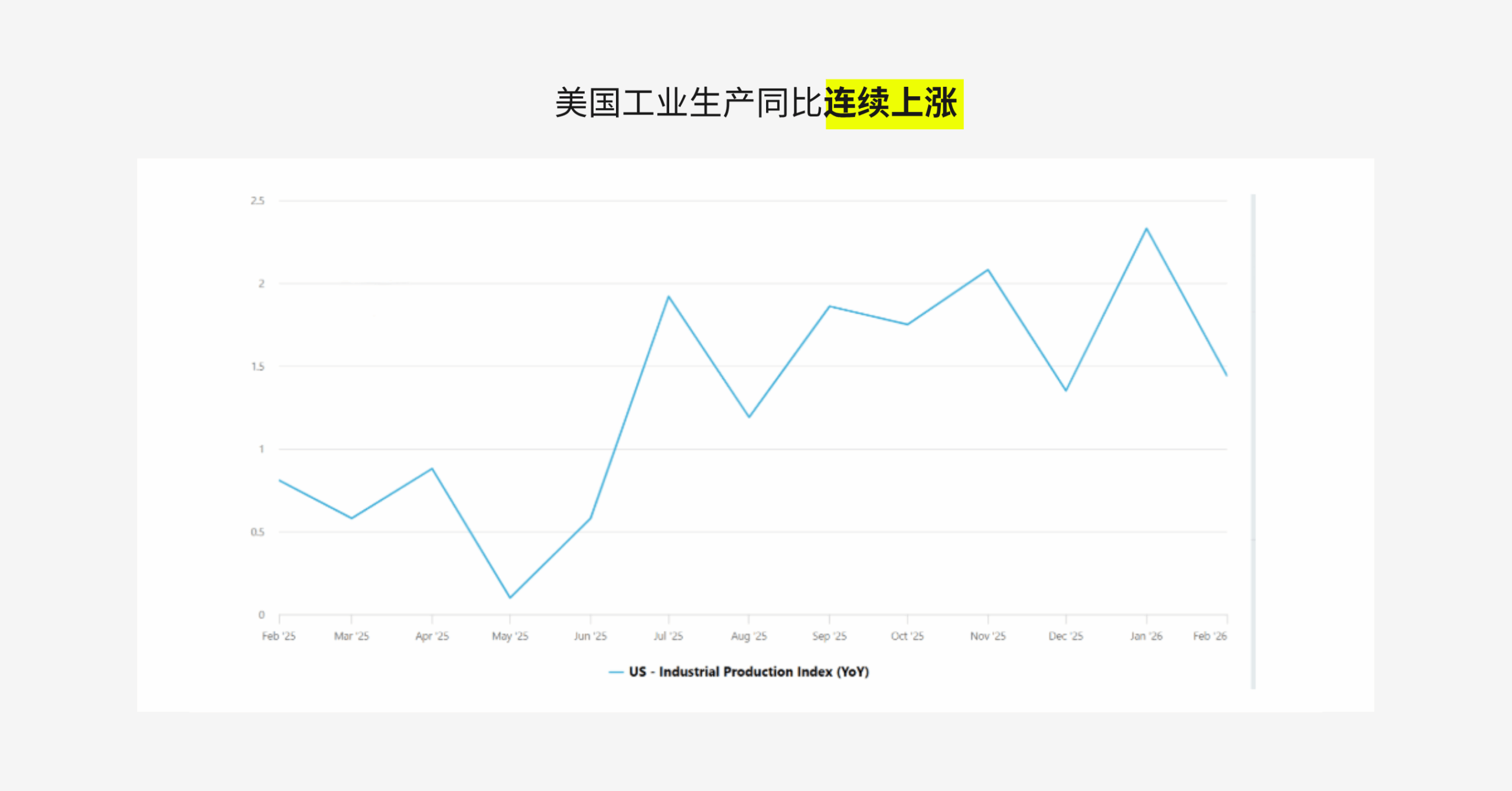 这轮复苏主要源于 AI 技术催生的新产能周期,进而带动了工业生产的持续增长。2 月美国工业生产环比增长 0.2%,虽低于 1 月的 0.7%,但已是连续第四个月维持正增长。同时,ISM 制造业 PMI 超出预期,表明工商业界整体对经济扩张抱有信心,对 AI 算力的需求预计将继续推动工业增长。