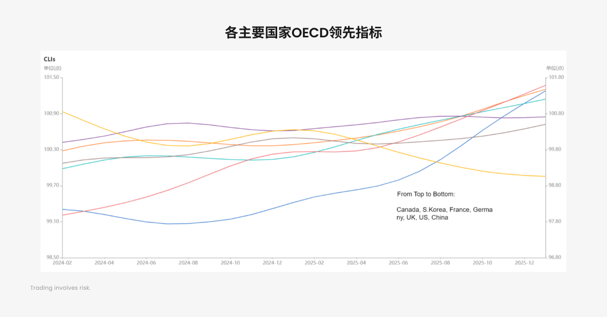此外,加拿大、韩国、德国、英国、法国的 OECD 领先指标自 2025 年起便处于上升趋势,全球经济正在复苏中,且欧元区的经济前景比美国更为乐观。值得注意的是,中国的 OECD 领先指标则走势相反,呈现下降趋势。