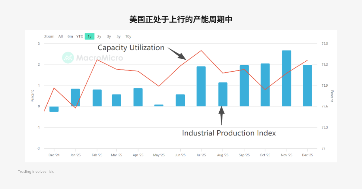 美国的产能利用率和工业生产指数再一次验证了经济正在扩张。产能利用率和工业生产同步扩张,意味着美国正在进入一个上行的产能周期,我们有理由认为,这一轮产能周期的动力来源于对算力的需求。是AI支撑了美国乃至全球的经济复苏。