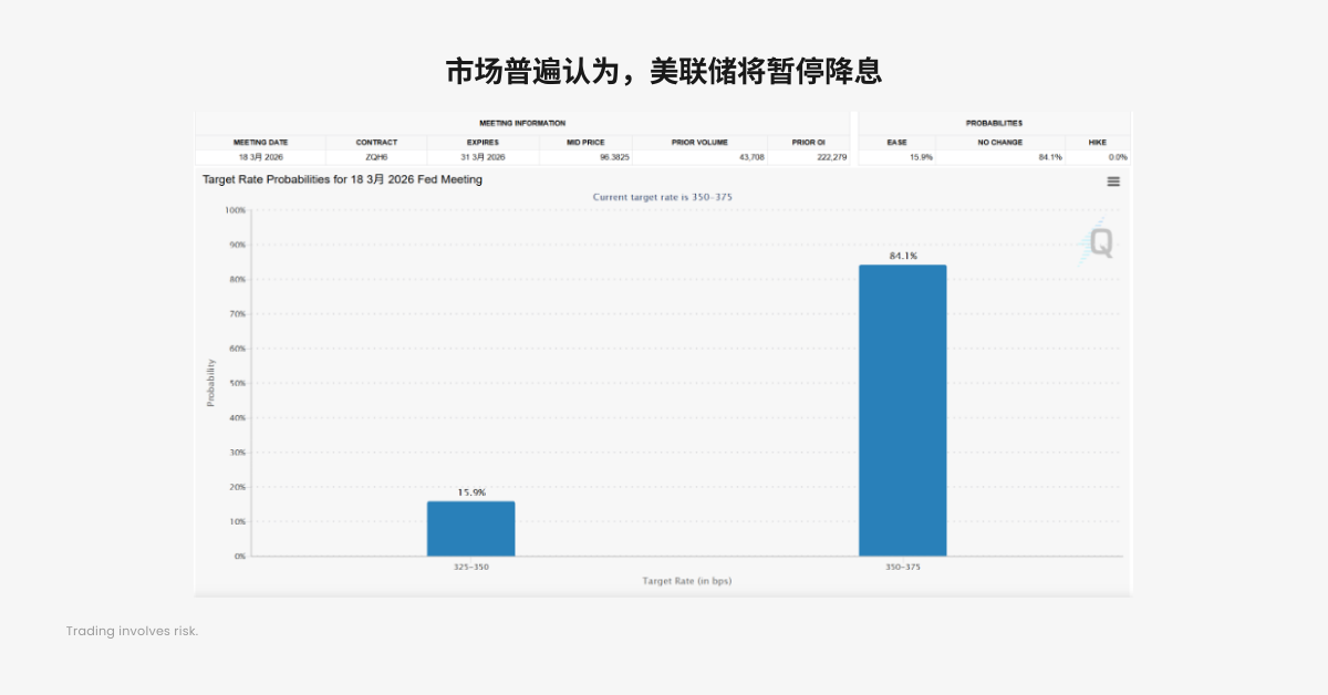 由于经济复苏,美联储似乎没有降息的必要,而这也是全球资本市场最为关注的地方,这段时间,经济基本面向好反而成了利空,因为投资者的关注焦点在流动性,经济数据强劲会降低美联储降息的预期,反而不利于大类资产上涨。CME 的调查显示,今年 3 月,美联储有 84.1% 的可能性保持利率不变。而 Kevin Warsh 上任的预期,又增加了资本对“缩表”的恐慌。如果经济保持增长,通胀卷土重来,Warsh 反而可能紧缩货币,抽走流动性,而这对于股票、比特币、黄金等大类资产来说,都是不小的打击。