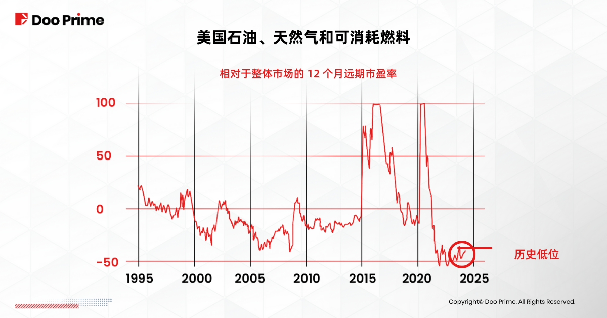 根据上面的图表,美国石油、天然气和可消耗燃料的市盈率,相对于整体市场来说是处于历史低位的。这可能是评估油价上涨风险时要考虑的一个因素。然而,低估值并不能保证价格一定会飙升,反而反映了当前的油价,与投资者对石油公司未来盈利能力的预期之间有所出入。