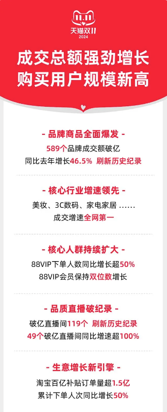 天猫公布,截至 11 月 11 日 24 点,2024 年天猫双11成交总额强劲增长,购买用户规模创新高。天猫双 11 全周期,589 个品牌成交额破亿,同比去年增长 46.5%,刷新历史纪录。