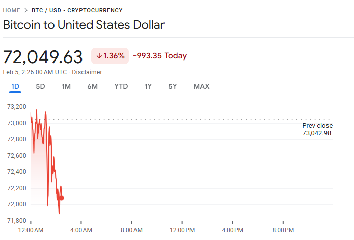 比特币价格周三大幅下跌,一度跌破 72,000 美元关口,刷新 15 个月新低,因全球市场避险情绪升温,投资者信心持续恶化。