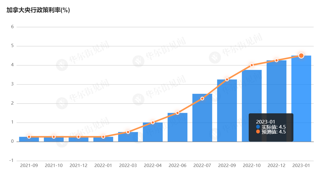 加拿大央行如期加息 25 个基点,这是加拿大央行自去年 3 月以来连续八次加息,基准利率已由 0.25% 提至 4.5%,为 2007 年 10 月以来的 15 年新高,累计升息达 425 个基点。