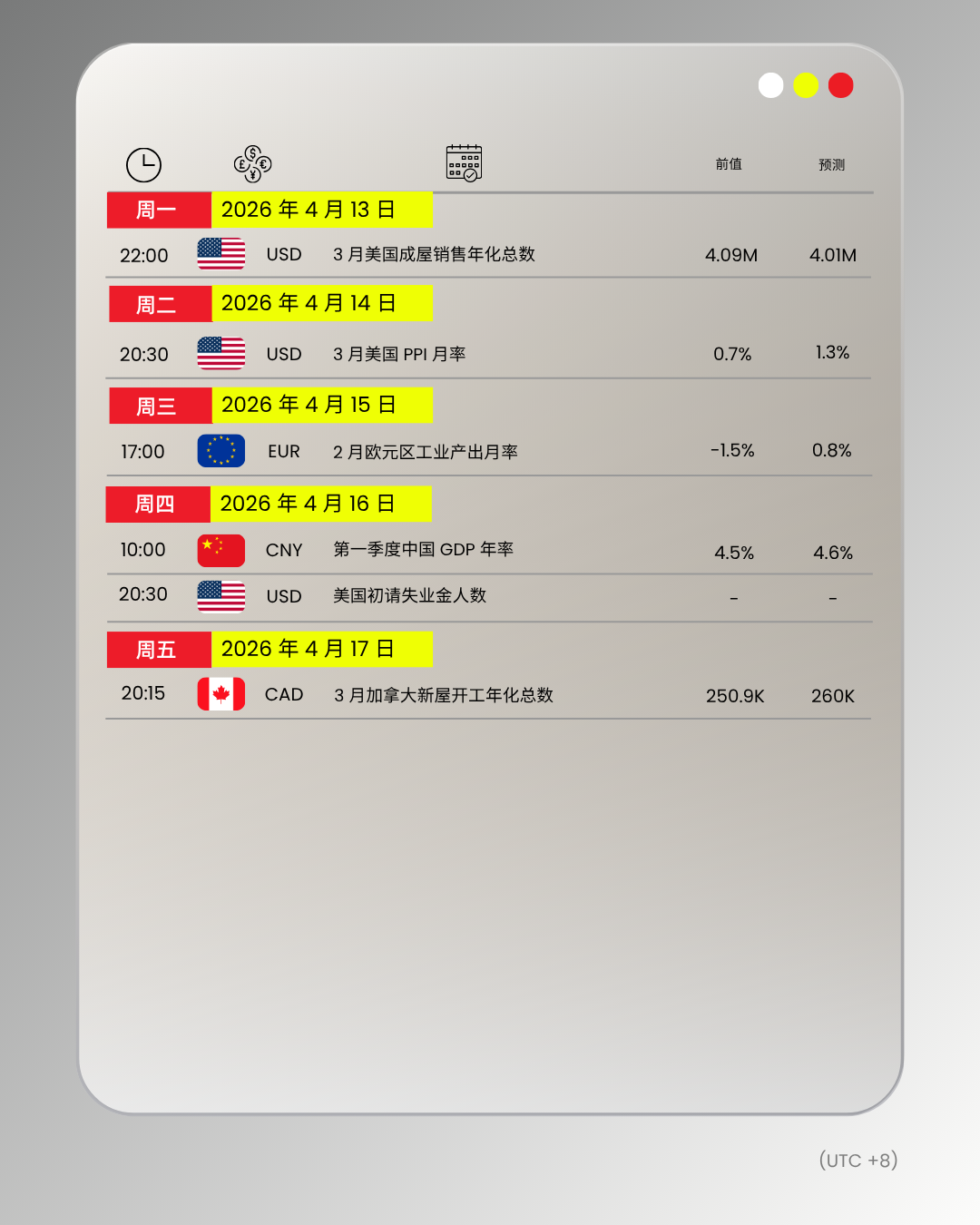 财经日历 | 以下为 2026 年 4 月 13 日至 2026 年 4 月 17 日(GMT+8 北京时间) 全球重大经济事件提醒。在重大行情期间,请确保您已审查您的保证金率,并有足够的保证金来支撑您的风险敞口。