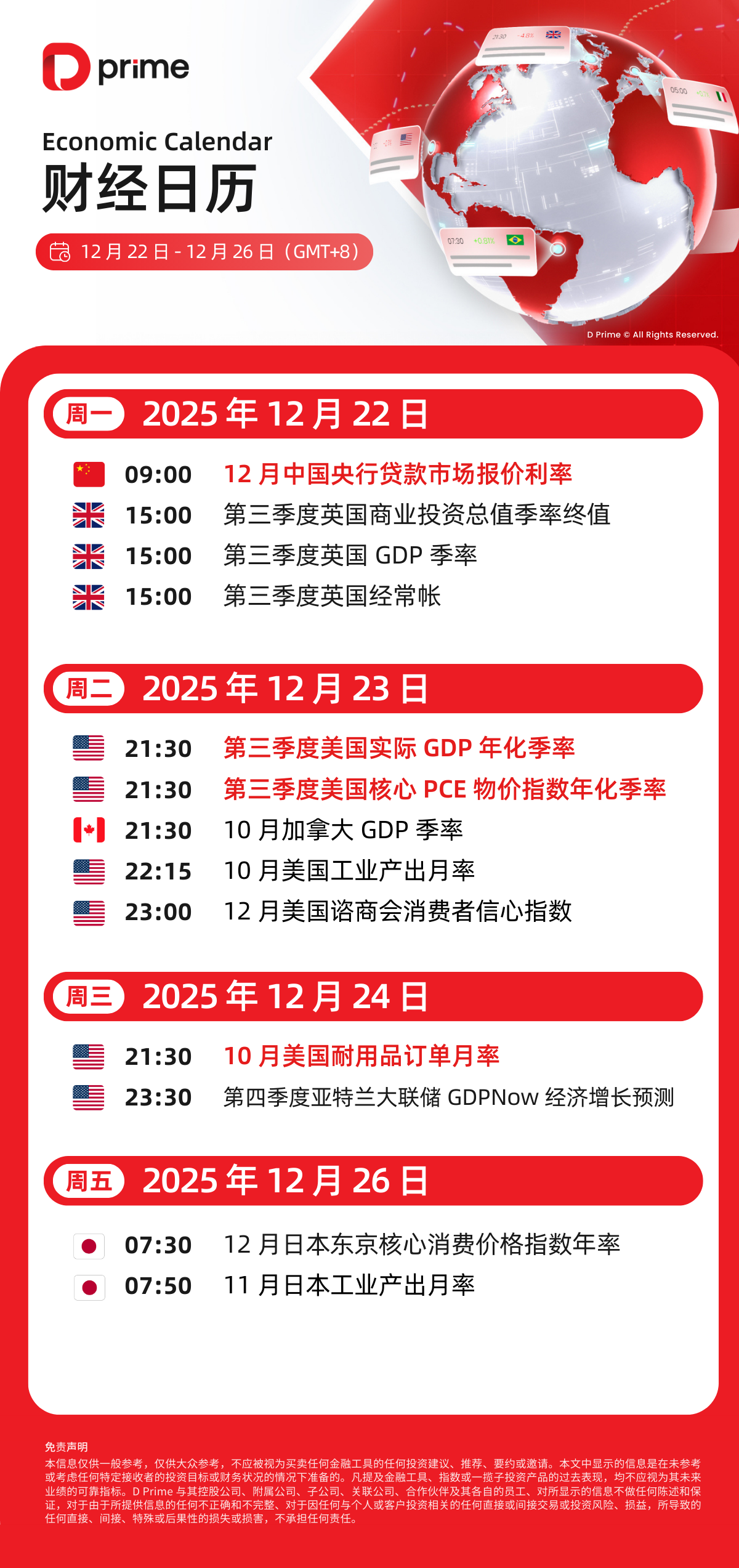财经日历 | 以下为 2025 年 12 月 22 日至 2025 年 12 月 26 日(GMT+8 北京时间) 全球重大经济事件提醒。在重大行情期间,请确保您已审查您的保证金率,并有足够的保证金来支撑您的风险敞口。