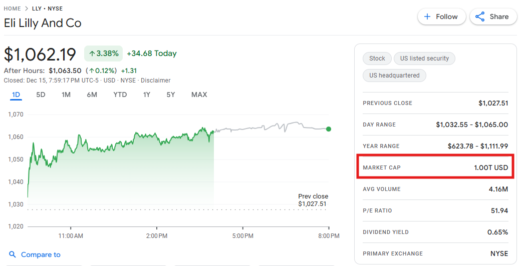 礼来市值一度突破 1 万亿美元,创全球首家“兆元药厂”纪录