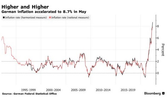 据德国联邦统计局周一公布的数据显示,德国 5 月通胀率从一个月前的 7.8% 升至 8.7%,远超预期的 8%,这也是德国半个世纪以来的最高水平。