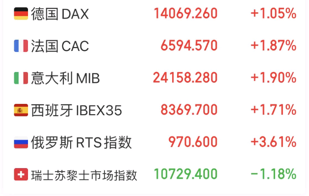 欧股主要指数集体收涨,其中德国 DAX30 指数涨 1.05%,法国 CAC40 指数涨 1.87%,意大利富时 MIB 指数上涨 1.90%,西班牙 IBEX35 指数涨 1.71%。