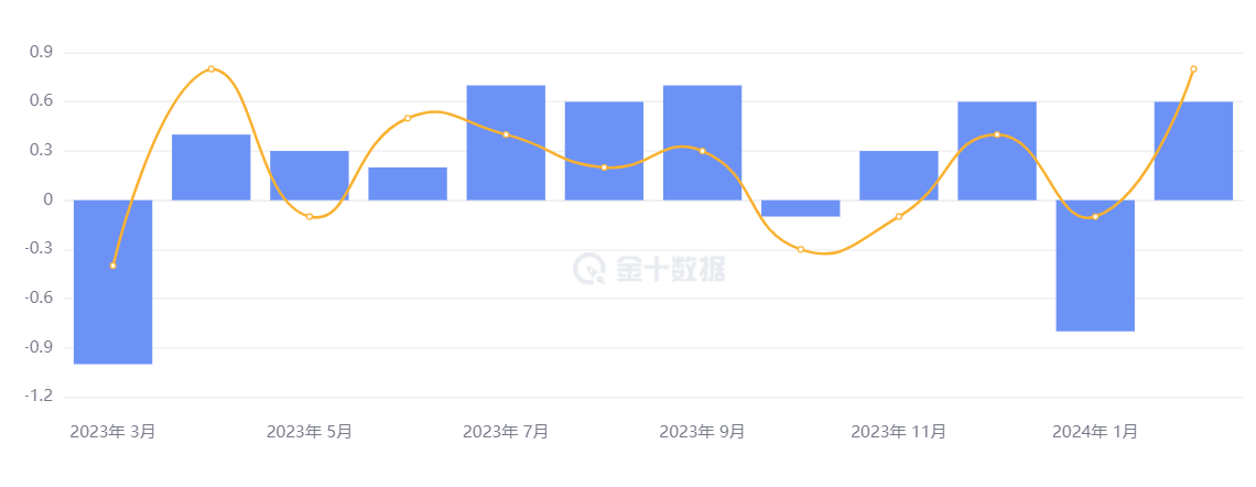 同日,美国商务部公布零售销售数据,2 月零售销售环比增速由负转正,环比涨 0.6%,远超 1 月的 -0.7%,但仍逊于 0.8% 的预期值。