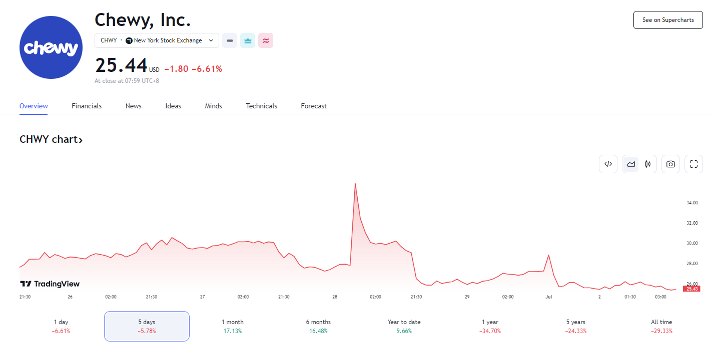 在吉尔持有 Chewy 6.6% 的股份被披露后,Chewy 股价盘中一度暴涨近 29%。不过,Chewy收盘时回吐全部涨幅,且下跌 6.6%。