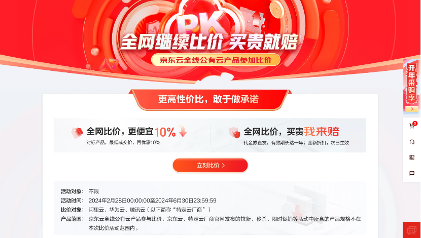 随后,京东云在活动中使出两把“杀手锏”,一是经过全网比价,对标产品最低成交价,再优惠10%;二是如果用户买贵,京东云直发代金券,有效期长达一年;新折扣次日生效。最新活动页面可以看到醒目的“全网比价 买贵就赔”活动,活动时间是 2024 年 2 月 28 日到 2024 年 6 月 30 日 23:59:59,比价的“特定云厂商”包含阿里云、华为云、腾讯云。