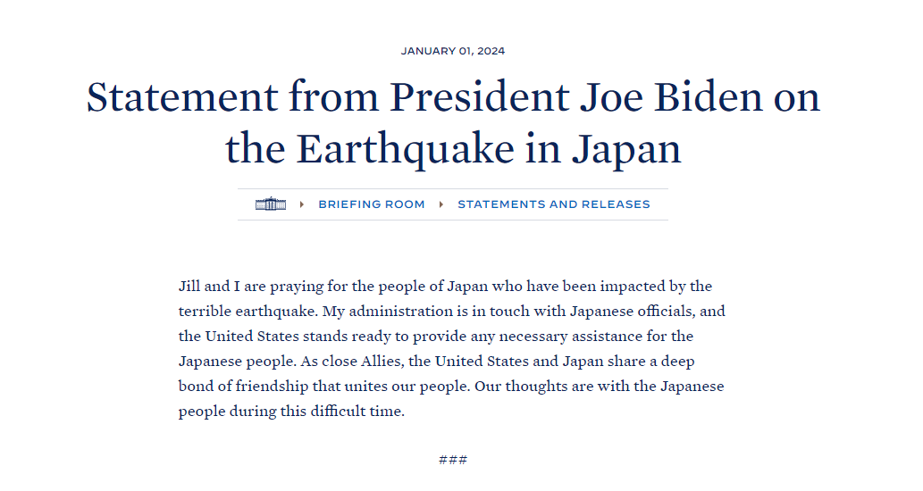 美国总统拜登就日本地震发表声明,称拜登政府正与日本官员保持联系,美国随时准备为日本民众提供任何必要的援助。