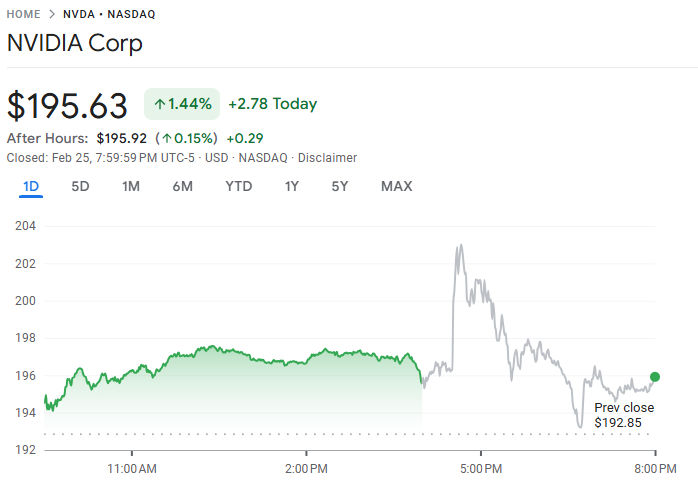 英伟达(NVDA)公布的第四财季业绩再度亮眼,营收同比飙升 73% 至 681.3 亿美元,每股收益(EPS)达 1.62 美元,均优于市场预期(分别为 662 亿美元与 1.53 美元)。公司 毛利率达 75.2%,略高于分析师一致预估。