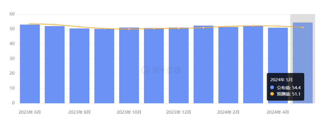 - 服务业 PMI 初值 54.8,创 12 个月新高,高于预期的 51.2 和前值 51.3;