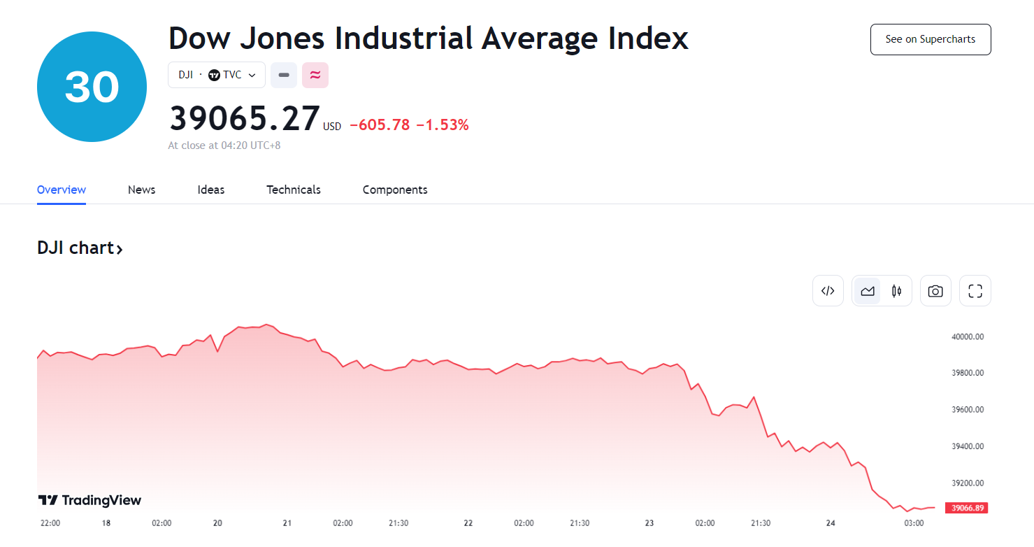 23 日,三大美股指盘中齐转跌,道指跌超 1%,创硅谷银行危机以来最大跌幅。截至收盘,道指跌 1.53%,标普 500 指数跌 0.74%,纳斯达克跌 0.39%。
