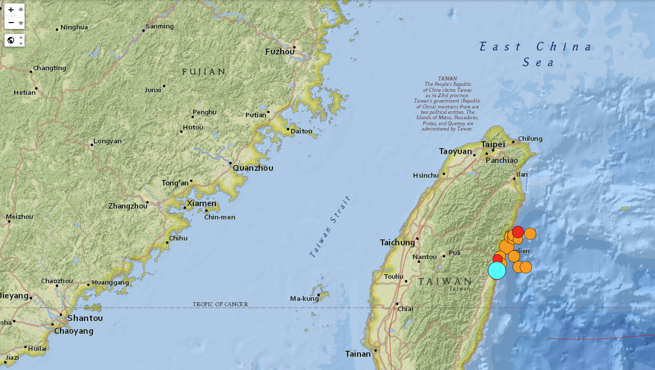 中国台湾花莲县海域发生 7.3 级地震,震源深度 12 千米,造成台湾全岛震感强烈,福建、广东等地震感非常明显,浙江、江苏、上海等地亦有震感反馈,为 25 年来最大规模地震。