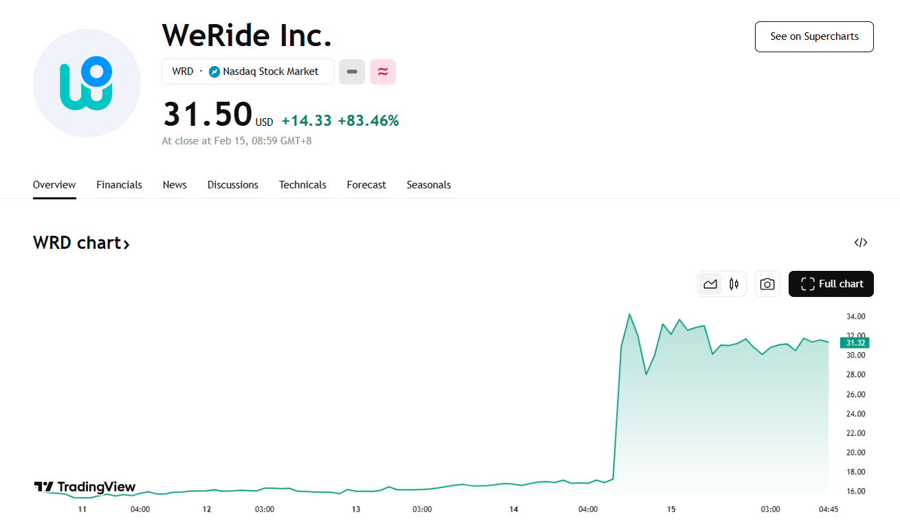 受此消息提振,文远知行(WDR)暴涨,盘中一度涨超 146%。随后因波动性过大而在美股盘初触发停牌,暂停交易前涨幅 135.35%。此后该股涨幅有所收窄,最终收涨 83.46%。
