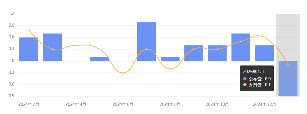 2 月 14 日,美国商务部公布的数据显示,1 月零售销售环比下降 -0.9%,远超预期值 -0.1%,前值为 0.4%,这是自 2023 年 3 月以来的最大环比下降。