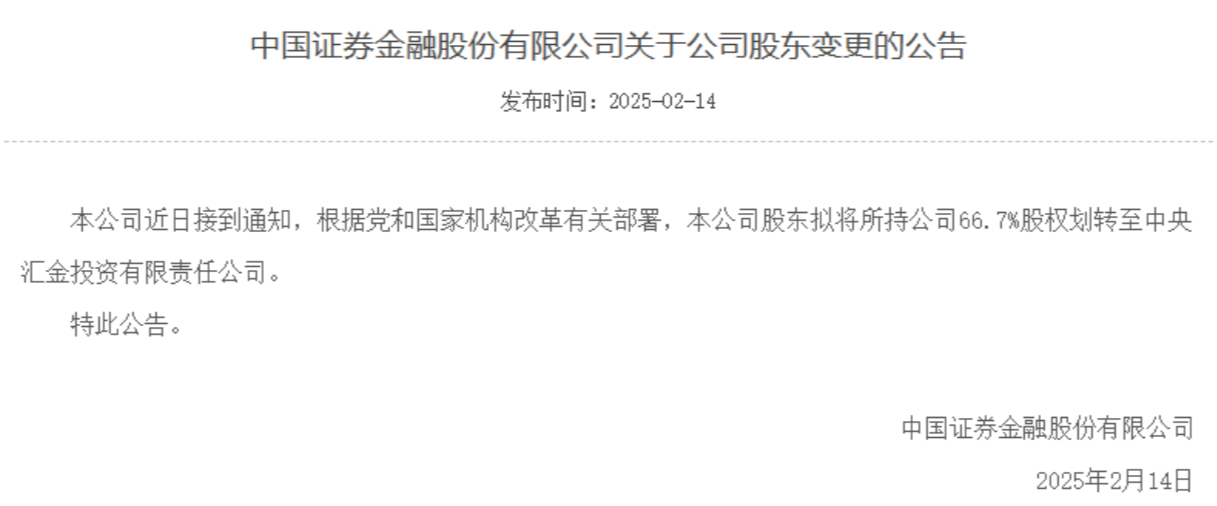 2 月 14 日,中国证金公司发布公告称,公司股东拟将所持公司 66.7% 股权划转至中央汇金公司。