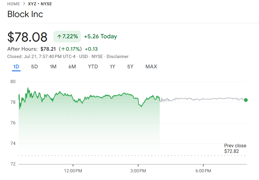 7 月 21 日,支付平台公司 Block(XYZ)周一股价强势上涨5.26美元,涨幅达7.22%,连续四个交易日收红,收盘价为 78.08 美元,创下自 2 月 20 日以来五个月的新高。当天成交额激增至 38.57 亿美元。