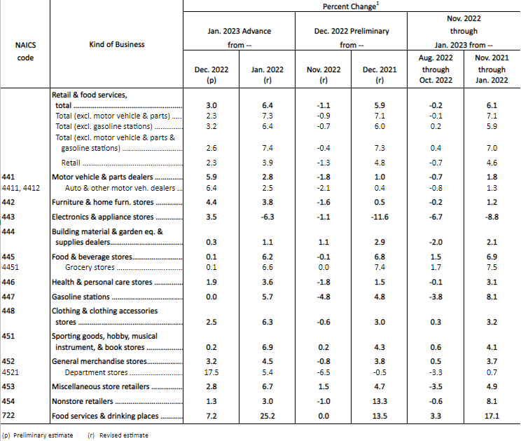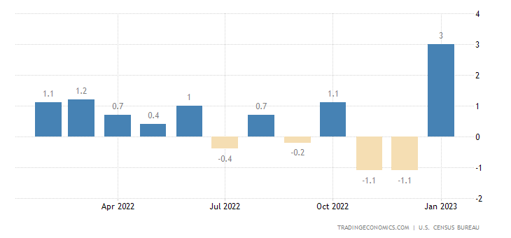 北京时间 2 月 15 日,美国商务部普查局发布 “恐怖数据” ,美国 1 月零售销售数据环比增加 3%,远超市场预期的 1.8%,前值为 -1.1%,为 2021 年 3 月以来最大增幅。