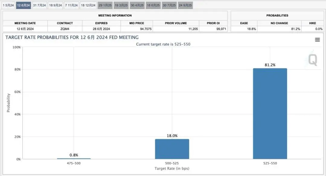 业内人士认为,通胀情况太热了,美联储不会放心降息。降息预期持续回落,6 月首降预期几近“破灭”。据芝商所美联储观察工具(FedWatch Tool),CPI 数据公布前市场预期美联储 6 月降息 25 个基点的概率约为 56%。数据公布后,市场大幅削减对美联储降息的押注,6 月降息 25 个基点的概率已降至 20% 以下。