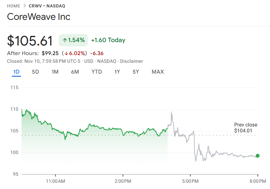 11 月 11 日至 12 日,CoreWeave(CRWV)公布第三季度财报,营收同比大增 132.9% 至 13.6 亿美元,优于市场预期的 12.8 亿美元;每股收益(EPS)为 -0.22 美元,显著好于市场预估的 -0.51 美元。