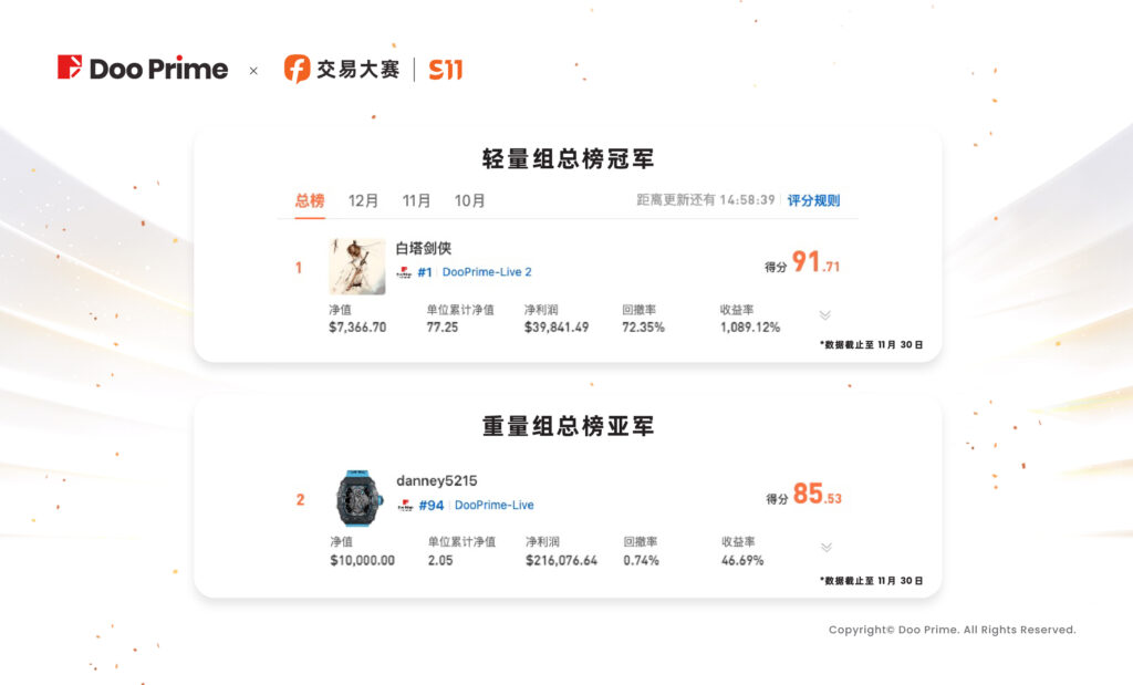 截止 11 月 30 日, Doo Prime 资深用户 ” 百塔剑侠 ” 荣获轻量组总榜第一名,净利润达 20 万美元; “ danney 5215 和 brood ” 两位 Doo Prime 用户则位列重量组总榜第二名和第三名,以低回撤率、高收益率平稳获利,优异的表现力证 Doo Prime 用户实至名归!