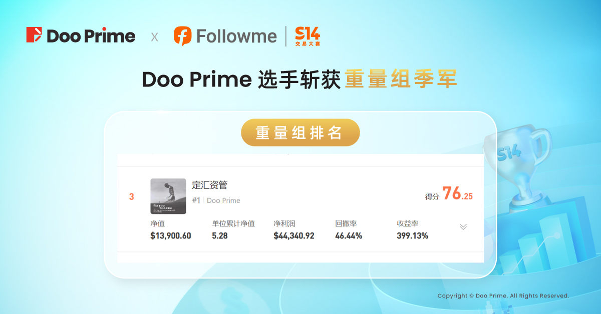 Doo Prime 的一众选手更在大赛中表现出色,其中 10 位 Doo Prime 交易员凭借卓越的交易技巧与稳定的投资表现,成功跻身 FOLLOWME S14 交易大赛总榜前五十名,充分展示了他们高超的交易水平以及强大的竞争力。