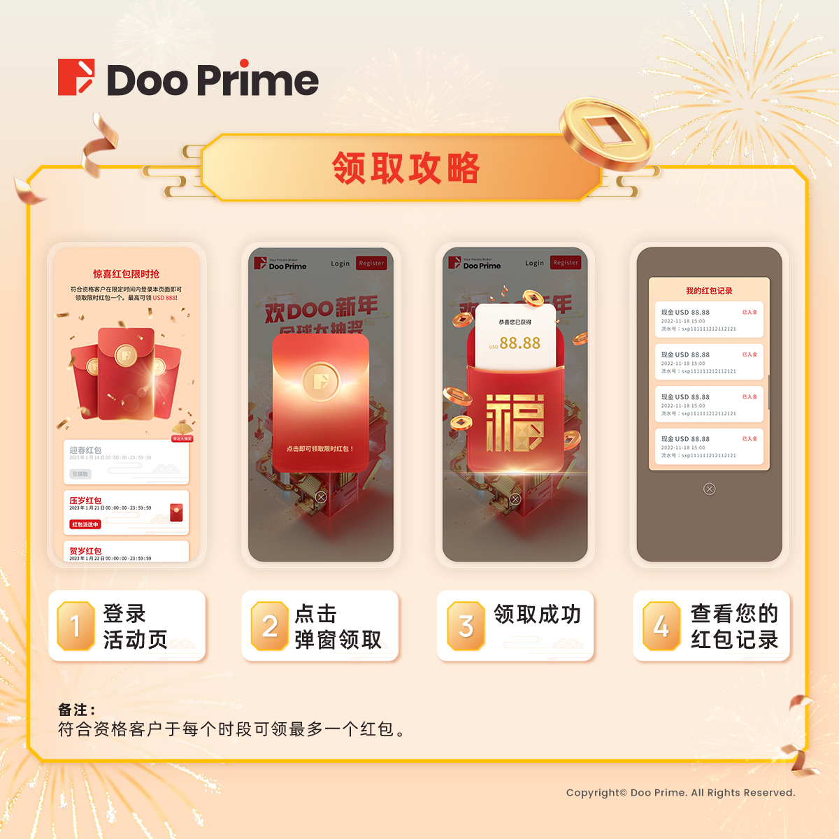 参与活动方式十分简单,只要您曾在 Doo Prime 入金  USD 100 + 交易 1 手,就有机会参与红包抽奖,最高可领取 USD 888 的发财红包!
