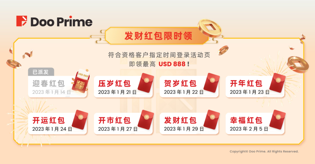 春节期间,除了新年全球大抽奖外,Doo Prime 也将重磅推出 8 次发财红包,首次发财红包已经于 1 月 14 日派发完毕,恭喜获得现金红包的客户。如果您错过了首批发财红包,那么千万不要错过接下来的 7 次限时发财红包。其中 4 次将会于 2023 年 1 月 21 日 00 : 00 (UTC + 8) 至 2023 年 1 月 24 日  23:59 (UTC + 8)派发,一连四天、每日一次的限量红包将会是您新年期间不可缺席的重磅福利,还有另外 3 次的发财红包也会在新年期间陆续派发。愿我们的客户在这个春节收获好运,在新一年顺利开启新征程。