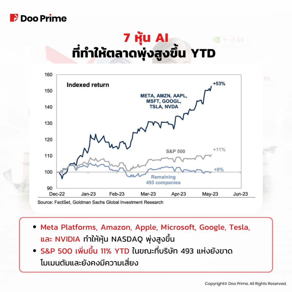 กระแส AI ได้ครอบครองตลาดไปแล้ว นักลงทุนมีความมั่นใจอย่างมากกับอนาคตของเทคโนโลยีใหม่นี้ จนหันหลังให้กับภาคอุตสาหกรรมอื่นในตลาด หุ้น AI เจ็ดตัวที่กล่าวข้างต้นล้วนทำกำไรได้สูงเป็นประวัติการณ์ในช่วงหลายเดือนที่ผ่านมา ตัวอย่างเช่น Meta มีมูลค่าหุ้นเพิ่มขึ้นกว่า 2 เท่าตั้งแต่ต้นปีที่ผ่านมา อย่างไรก็ตาม ในช่วงเวลาเดียวกัน บริษัทส่วนใหญ่ใน S&P 500 ยังไม่มีโมเมนตัมที่ทำให้หุ้นขึ้น