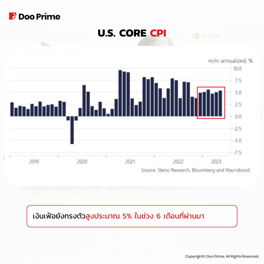 ในช่วงไม่กี่เดือนที่ผ่านมา อัตราเงินเฟ้อดูเหมือนจะคงที่ที่ประมาณ 5% ทำให้เฟดพิจารณาแผนการ ‘หยุดการปรับขึ้นอัตราดอกเบี้ยชั่วคราว’ โดยประธานพาวเวลล์เน้นย้ำถึงเป้าหมายการแก้ไขปัญหาเงินเฟ้อของเฟดให้อยู่ที่ 2% และคาดว่าจะเกิดการปรับขึ้นดอกเบี้ยอีกในอนาคตเพื่อแก้ปัญหาภาวะเงินเฟ้อ “ที่หนทางยังอีกยาวไกล” หลังจากพาวเวลล์ปราศรัยแล้ว ความเป็นไปได้ที่จะเกิดการปรับขึ้นอัตราดอกเบี้ยในเดือนกรกฎาคมแตะ 80% และมีโอกาส 15% ที่จะเกิดการปรับขึ้นอัตราดอกเบี้ยอีก 2 ครั้งในเดือนกันยายน ดูเหมือนเฟดจะยังไม่ถอยในเร็วๆ นี้