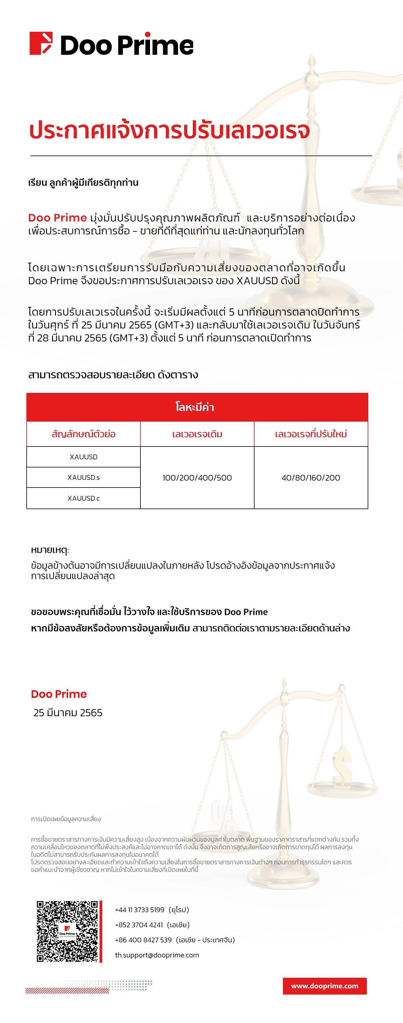Doo Prime ประกาศแจ้งการปรับเลเวอเรจ ประจำวันศุกร์ที่ 25 มี.ค. 2565