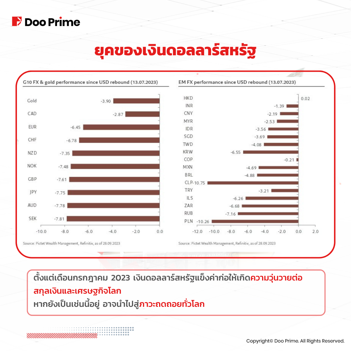 ตั้งแต่เดือนกรกฎาคม 2023 ดอลลาร์สหรัฐแข็งค่าครอบงำทั้งตลาด โดยเกือบทุกสกุลเงินในโลกอ่อนค่าลงเมื่อต้องเผชิญกับอัตราดอกเบี้ยและอัตราผลตอบแทนพันธบัตรที่เพิ่มขึ้นอย่างรุนแรง