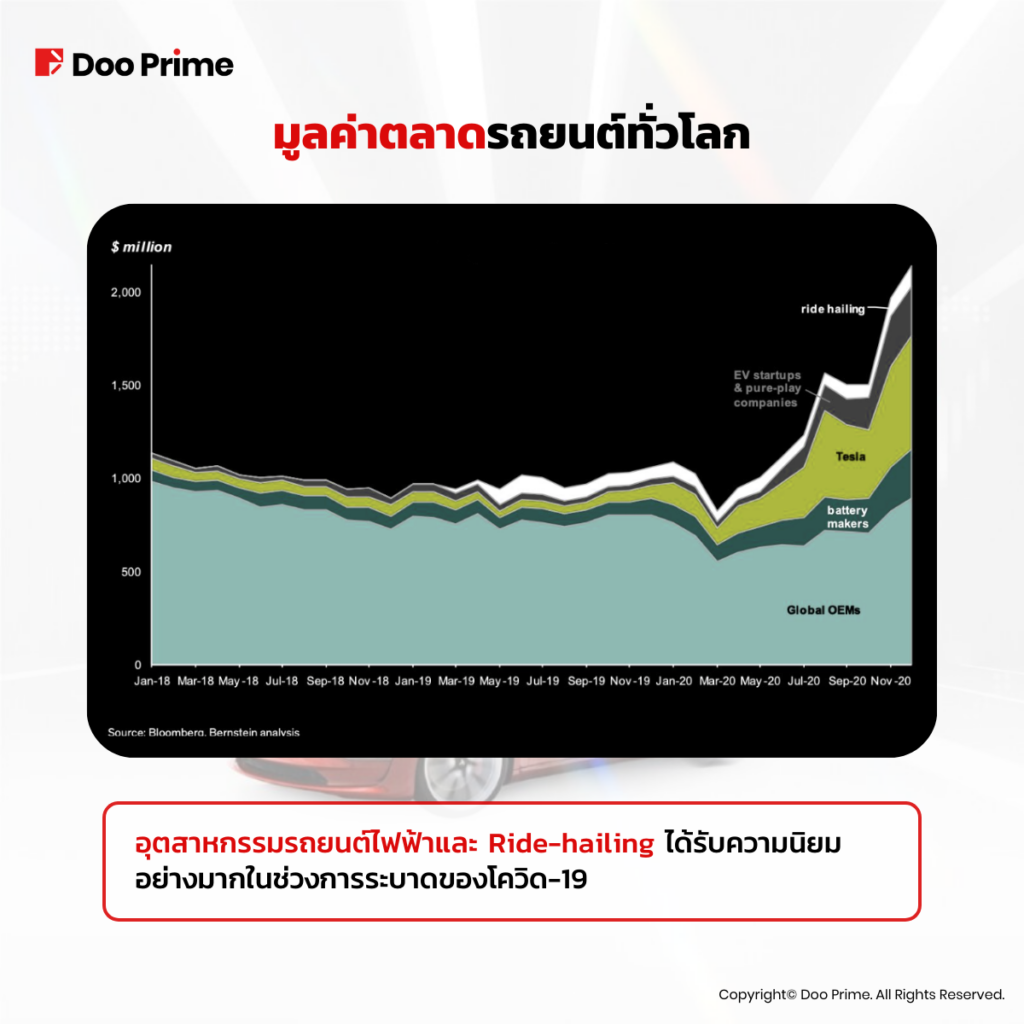 ปัจจัยสำคัญอีกประการหนึ่งคือการเปลี่ยนแปลง Paradigm ที่เกิดขึ้นในตลาดโดยรวมในช่วงการระบาดของโควิด-19 ผู้บริโภคและนักลงทุนต่างตระหนักถึงประโยชน์ด้านสิ่งแวดล้อมของรถยนต์ไฟฟ้ามากขึ้น ส่งผลให้ความต้องการ EV เพิ่มขึ้นทั้งอุตสาหกรรม ไม่ใช่เพียง Tesla เท่านั้น รวมถึงบริษัท Ride-hailing อย่าง Uber และ Lyft ด้วย