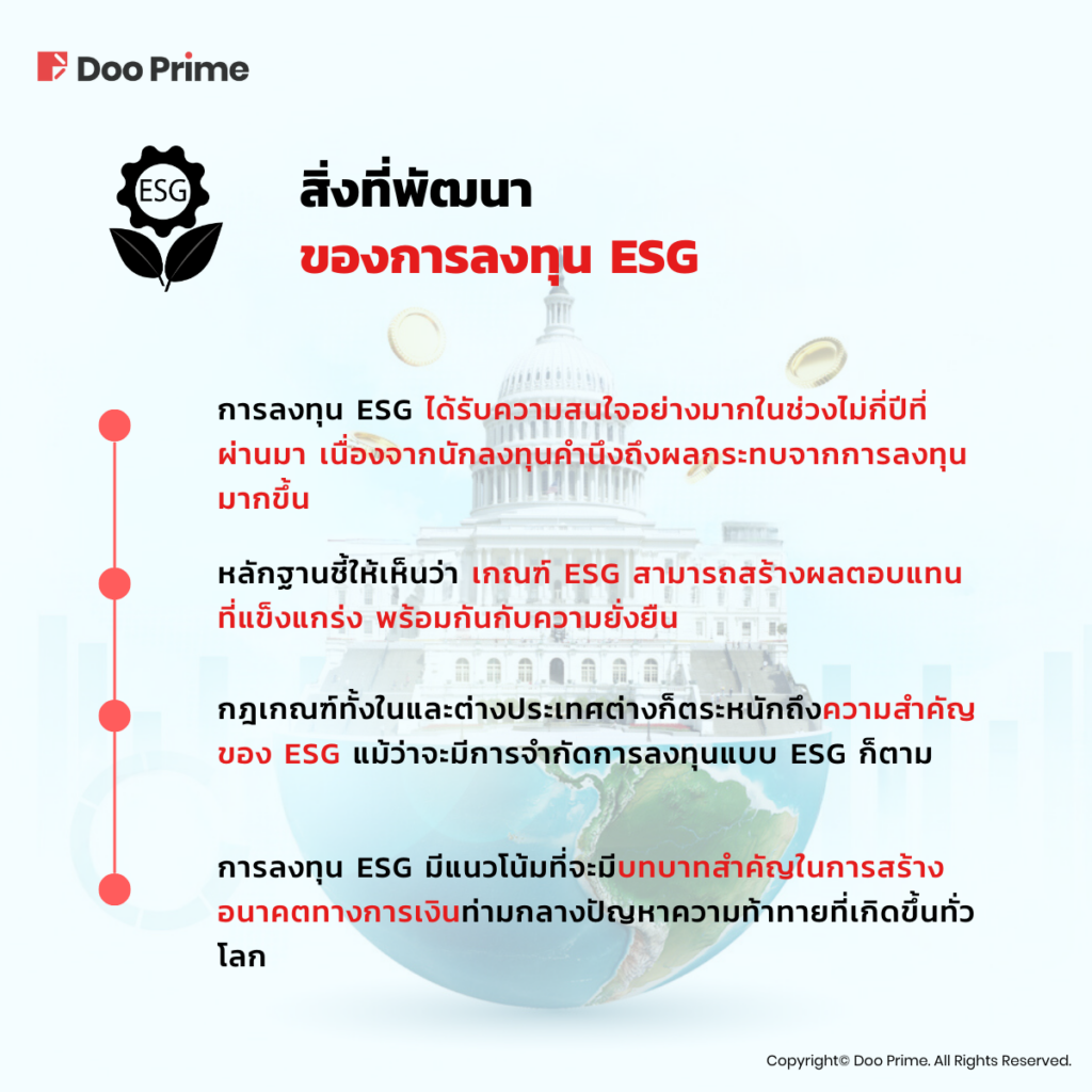 การลงทุน ESG ได้รับความสนใจอย่างมากในช่วงไม่กี่ปีที่ผ่านมา เนื่องจากนักลงทุนคำนึงถึงผลกระทบด้านสิ่งแวดล้อม สังคม และธรรมาภิบาลจากการลงทุนมากขึ้น