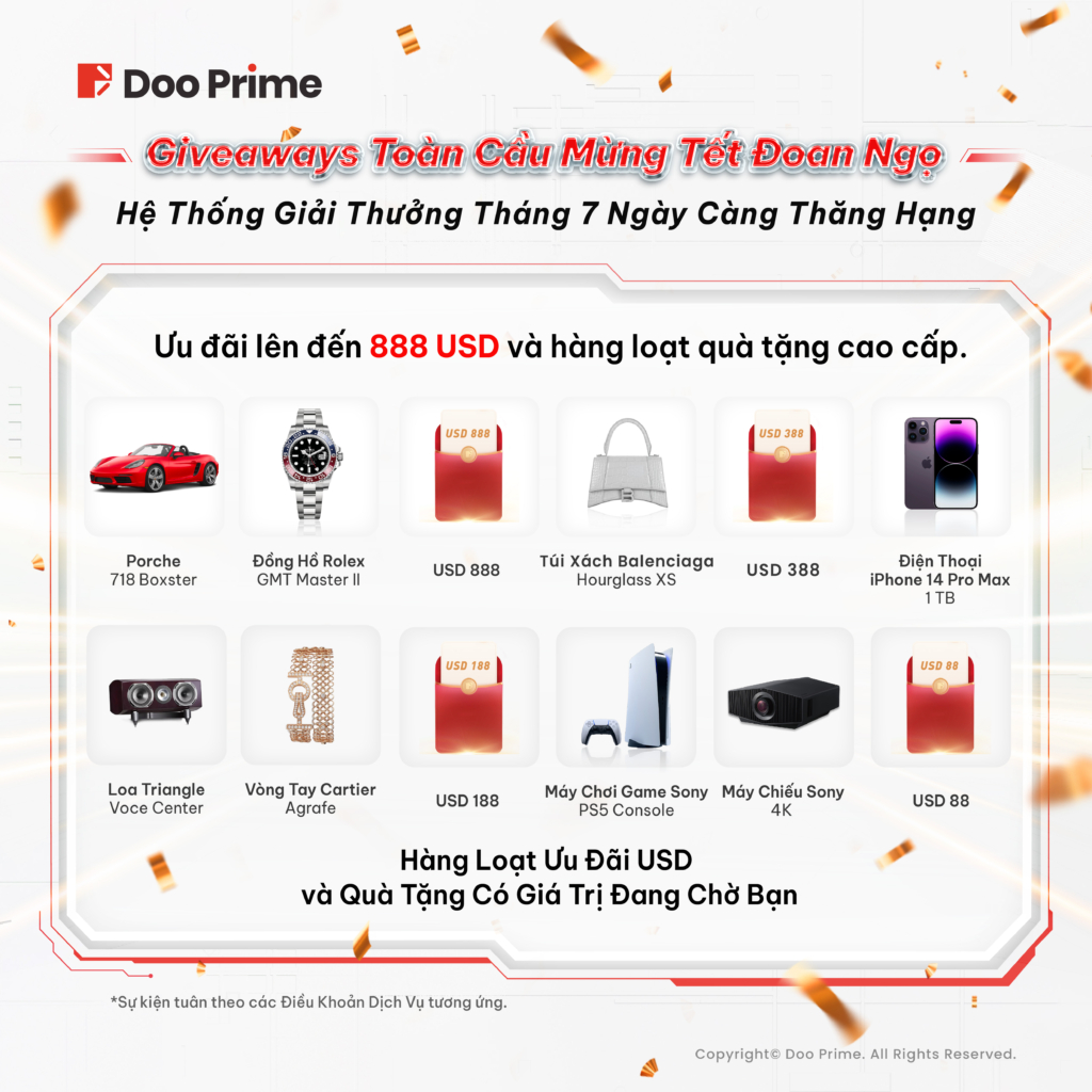 Giveaways Toàn Cầu Mừng Tết Đoan Ngọ của Doo Prime đang chứng tỏ sức nóng hơn bao giờ hết trong những ngày vừa qua. Trải qua gần một tháng ra mắt, chiến dịch đã hé mở hơn 20,000 cơ hội chiến thắng cho người chơi. Đáng chú ý, các giải thưởng tiền mặt “khủng” từ chương trình đã nhận được những phản hồi tích cực từ quý khách hàng trên toàn cầu. Nhằm đáp lại sự ủng hộ nồng nhiệt từ quý vị và các bạn, chúng tôi quyết định cho ra mắt loạt giải thưởng với giá trị thăng hạng hơn nữa trong tháng 7. Tham gia vào ngay hôm nay để khởi đầu hành trình giao dịch đầy kỳ thú cùng chúng tôi!