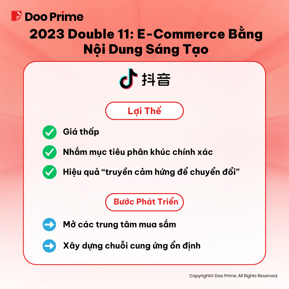 Douyin, nền tảng chủ yếu cung cấp các nội dung sáng tạo, đại diện cho các sàn thương mại điện tử theo hướng này. Ngoài các video ngắn và livestream, Douyin còn đang mở rộng sang dạng thương mại điện tử bằng chữ và hình ảnh.