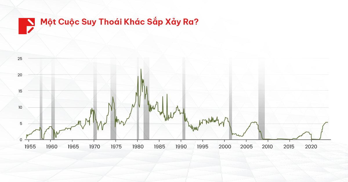 Dữ liệu lịch sử cho thấy một mô hình chung: việc kết thúc chu kỳ thắt chặt của Fed thường xảy ra trước thời kỳ suy thoái kinh tế, như được mô tả trong các vùng màu xám trên biểu đồ đi kèm.